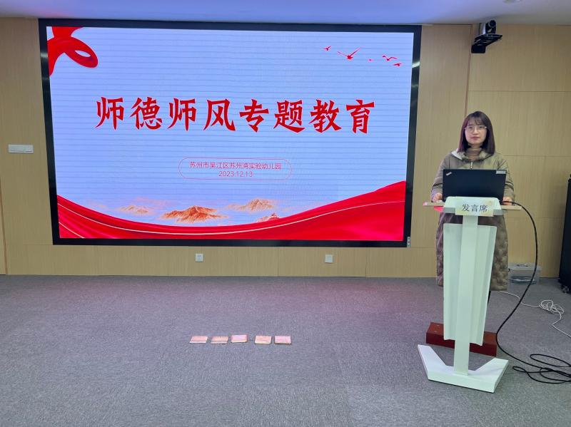 为进一步加强幼儿园师德师风建设,强化教师的责任意识,营造互帮互学、团结互助的良好氛围,2023年12月13日,吴江区苏州湾实验幼儿园开展了以“立德树人,团结奋进”为主题的师德师风专题活动,活动由史春晓老师主持,全体教师参加。